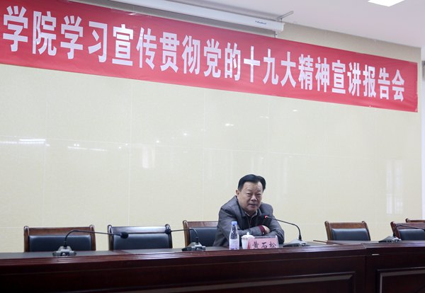 宣讲会上,黄石松副校长紧扣党的十九大报告,紧紧围绕“新时代、新思想、新征程”对党的十九大主题与主要成果、习近平新时代中国特色社会主义思想、坚定不移推进全面从严治党等进行了深入阐述和剖析。对于学习贯彻党的十九大精神,黄石松副校长提出三点建议:一是要坚定信念,对中国特色社会主义道路坚定不移;二是要奋发图强,撸起袖子加油干;三是要率先垂范,全体党员模范带头,全力推进各项工作。